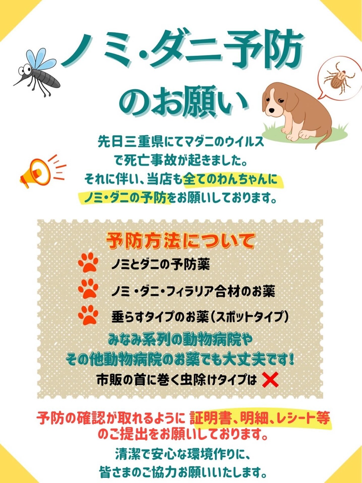 それに伴い、当店でも全てのわんちゃんにノミ·ダニの予防をお願いしております。